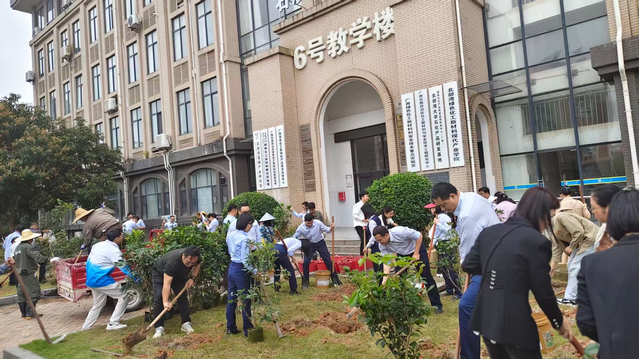 2026年3月19日上午10时,机关第十党支部党员与北部湾银行党员同志齐聚北部湾大学6号楼门前空地,共同开展桂花树种植活动,我校陆衡副校长以普通党员身份参与。