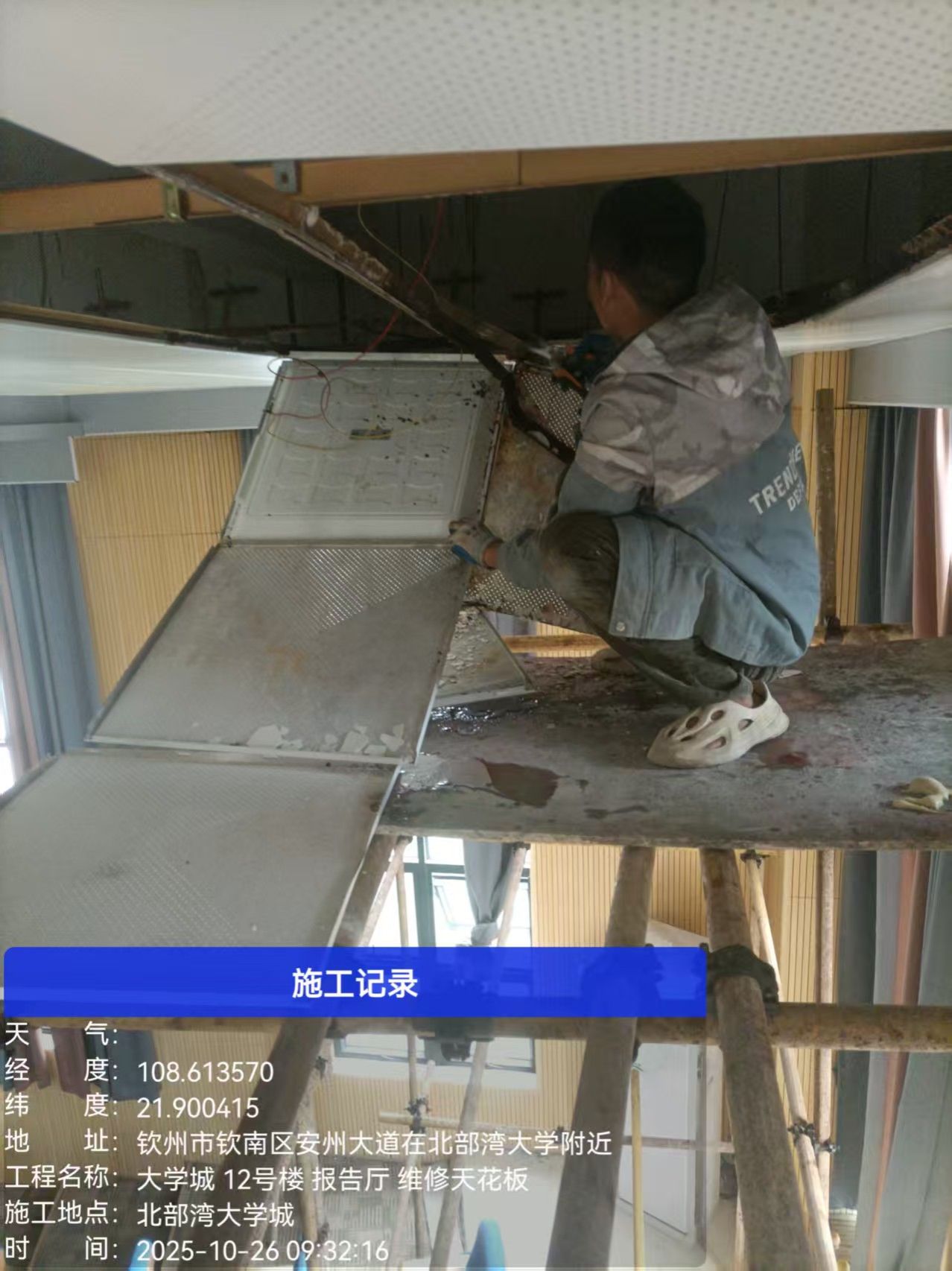 2025年10月26日,基建处通过抽查方式现场查看防水补漏施工情况,重点检查各渗漏点维修质量及施工进度,确保维修措施落实到位,全力保障校园设施安全稳定运行,为师生营造安全舒适的教学生活环境。