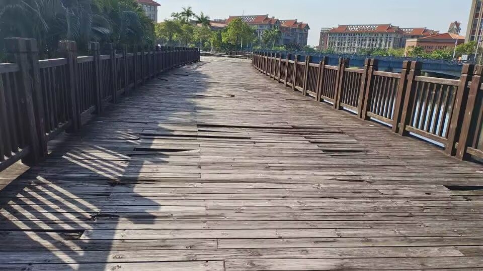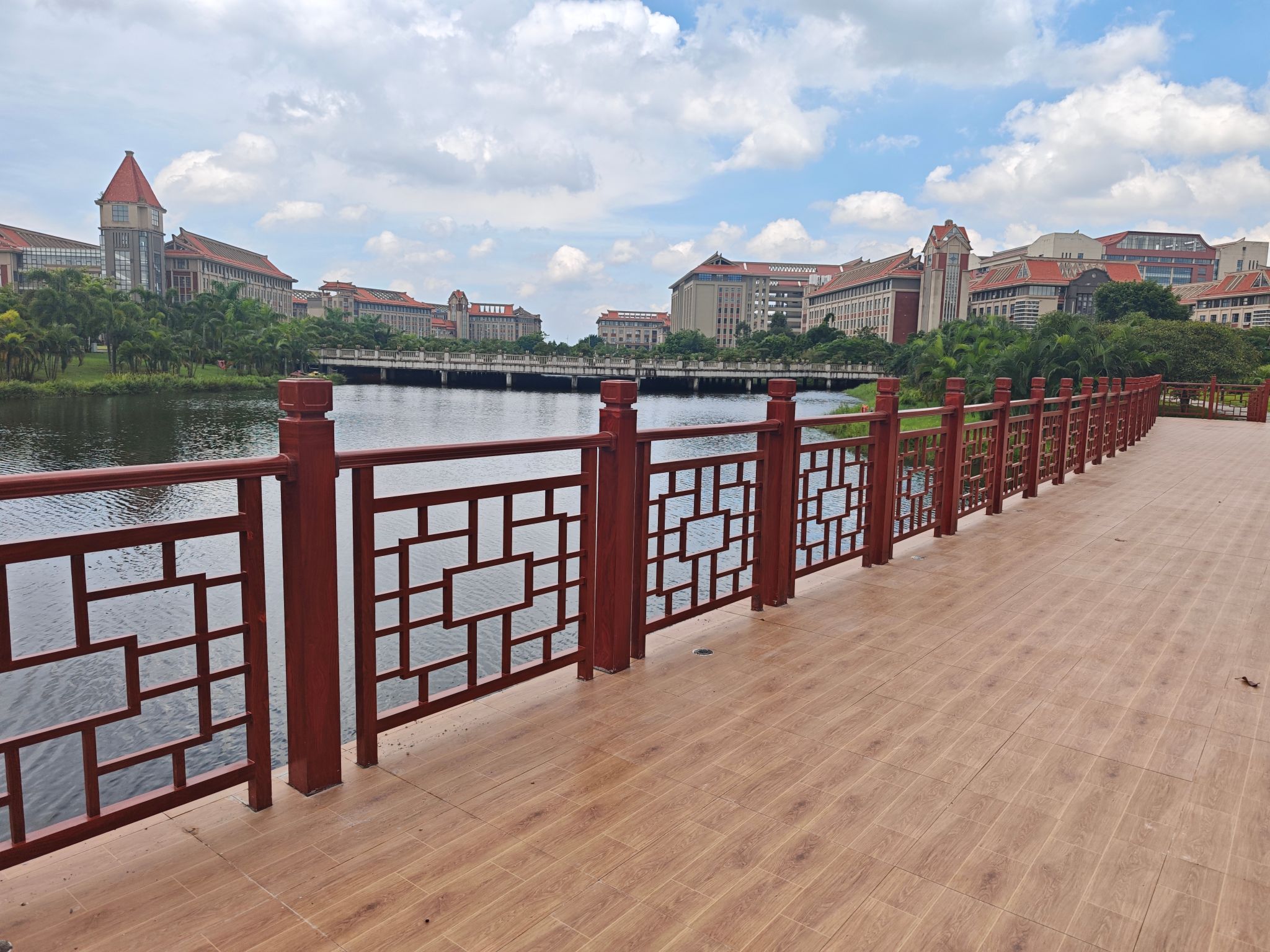 作为极具岭南特色的3A级景区,北部湾大学绕水而建、树木葱郁,校园中轴线的11号教学楼南侧景观平台,更是串联自然与人文的点睛之笔——师生在此白日可远眺湖光色、夜晚能静赏灯火阑珊,早已成为校园生活中兼具实用与诗意的标志性空间。然而,受长期风吹日晒雨淋影响,景观平台连廊木质结构逐渐出现腐朽、松动,不仅影响观景体验,更形成安全隐患。为守护师生安全、重现景观魅力,基建处主动谋划、抢抓暑假窗口期,正式启动该区域修缮工程,通过更换受损构件、强化防腐处理、优化细节设计,让这一“校园观景台”重焕生机。