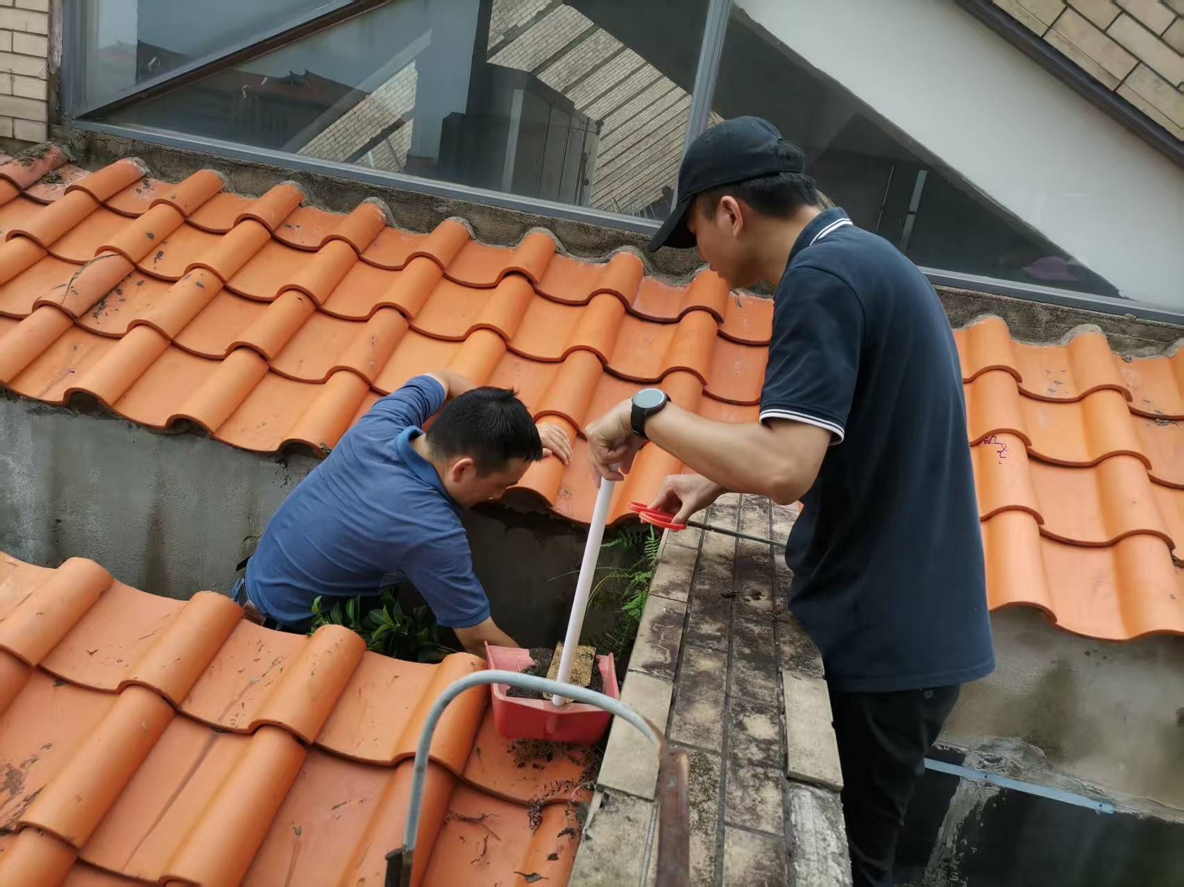 面对楼顶积水的紧急情况及攀爬倾斜屋面、清理狭窄天沟的高空坠落风险与腐叶淤泥刺鼻环境,全体工作人员分组协作,历经3小时连续奋战,彻底清除楼顶及天沟内枯枝杂草与建筑垃圾,疏通排水通道12处,大大提高了排水效率,有力消除了漏水隐患。